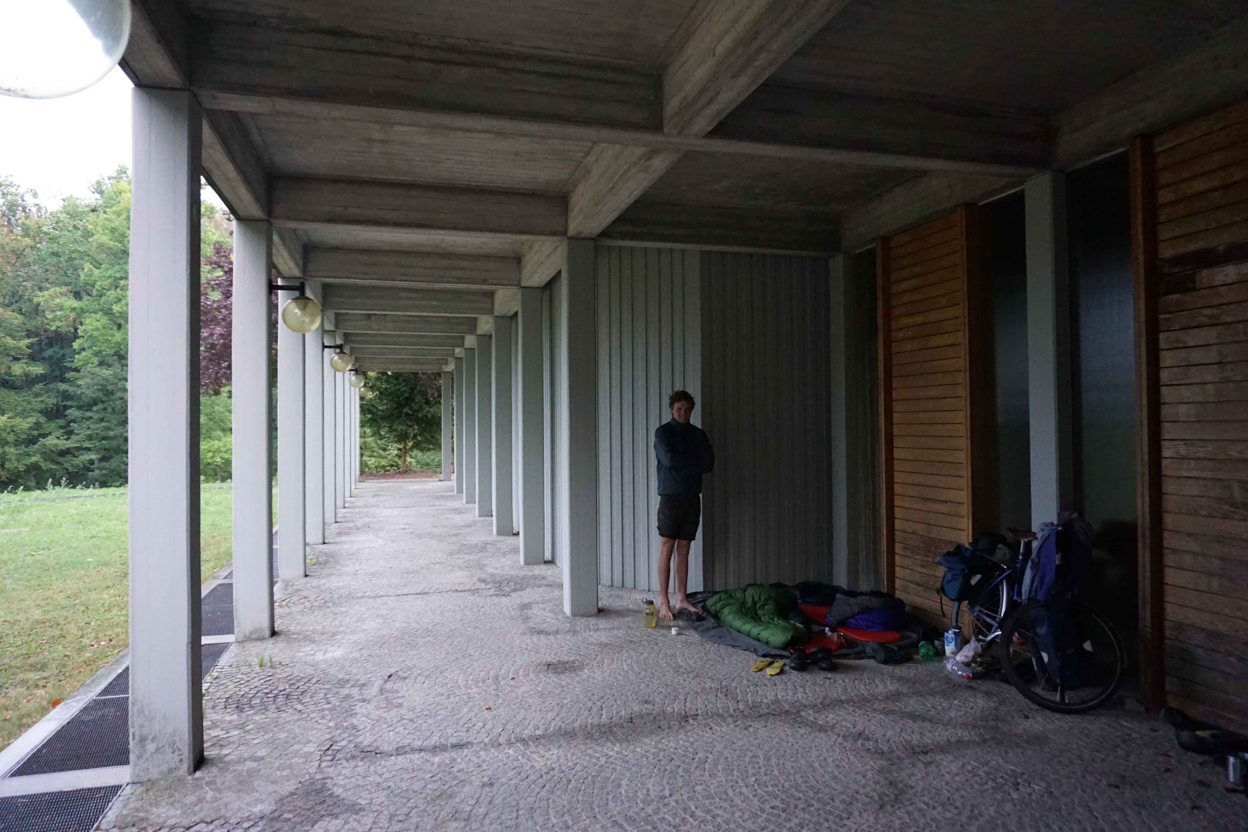 I remember in our previous tour around the Baltic Sea I started off really wary of camping in public places, the first time it occurred to us I felt it was too risky and so we ended up in a £30 a night campsite on the coast. It feels odd to think how my attitude towards it has changed. In the photo below we were soaked through and cycled past this huge graveyard on a hill with a large meeting room in the middle. It was deserted so we decided to take shelter and wait for the weather to blow over, one hour turned into another and at some point, we decided to stay there. But not only stay, but also stay and sleep under the veranda of the building. A year ago that would have made me so nervous! Especially in Germany.