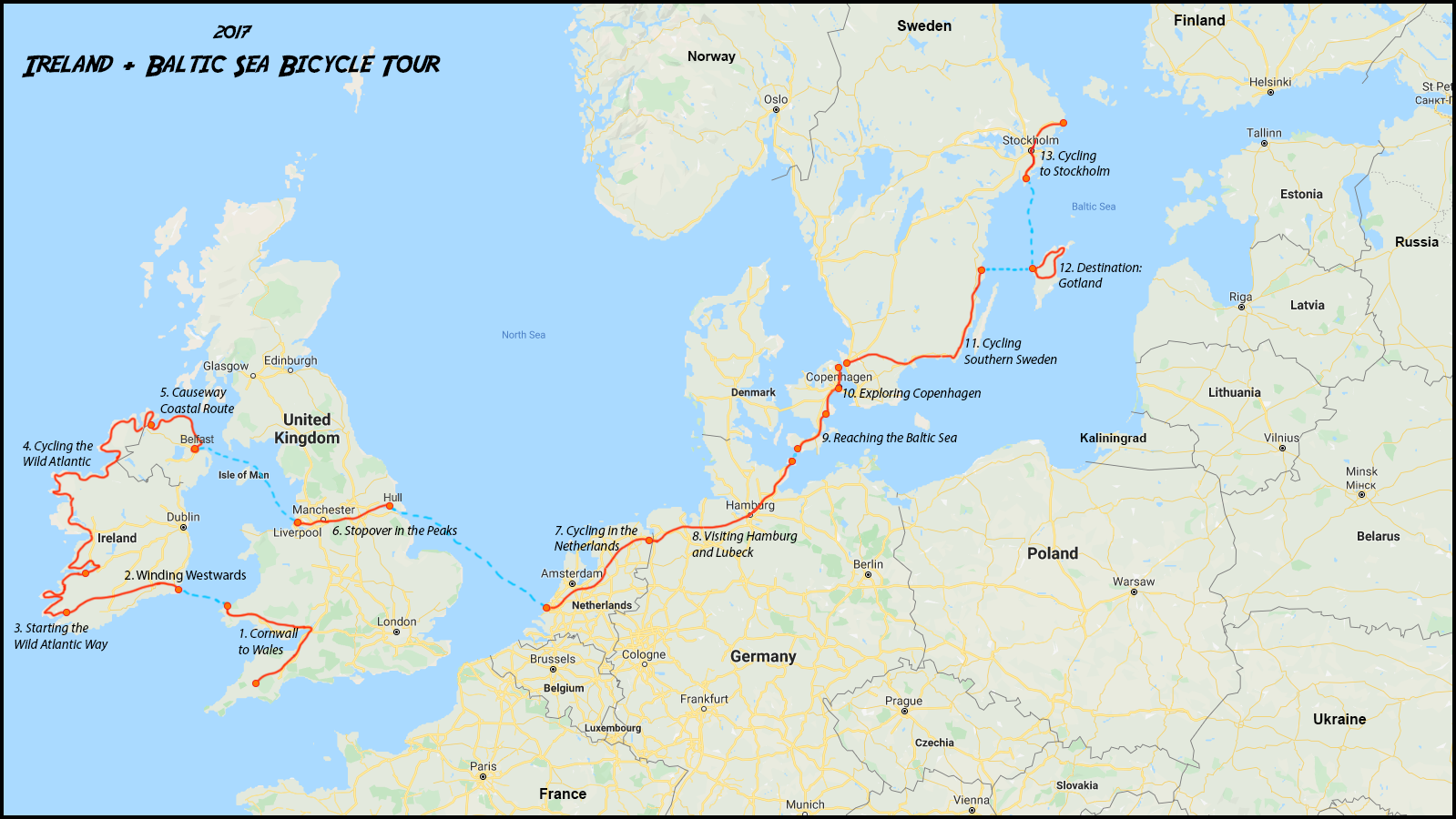Before launching into the cycle tour from Gotland in my previous post up past Stockholm to the port of Kapellskär I wanted to give you a quick overview of the the tour so far. We left Cornwall on the 20th May, and spent 32 days cycling in Ireland. We then cut across the UK to Rotterdam in the Netherlands and started heading north to join Eurovelo 10. This post takes us to the 27th July, so 68 days of cycling later we’re in Stockholm!