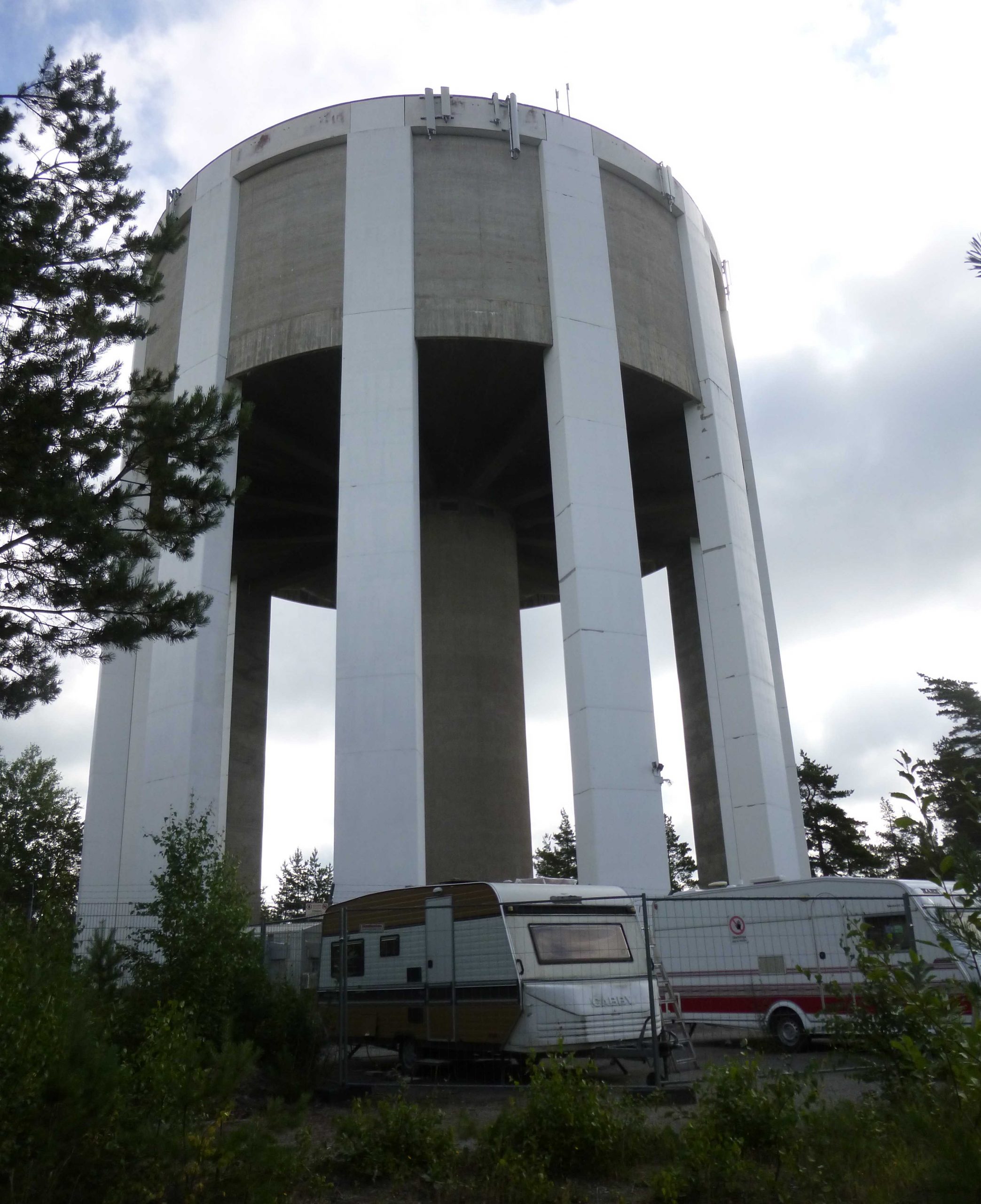 About 16km from Stockholm we were desperately looking for somewhere to camp when we spot a water tower surrounded by trees on top of a hill. Having not seen anywhere else that looked good, and going in to an increasingly populated area, we decided to follow the narrow track up to the watertower and try and find somewhere hidden away. The water tower itself was fenced off and surrounded by dodgy looking caravans, so we pushed our bikes into the woods and found a spot out of sight.