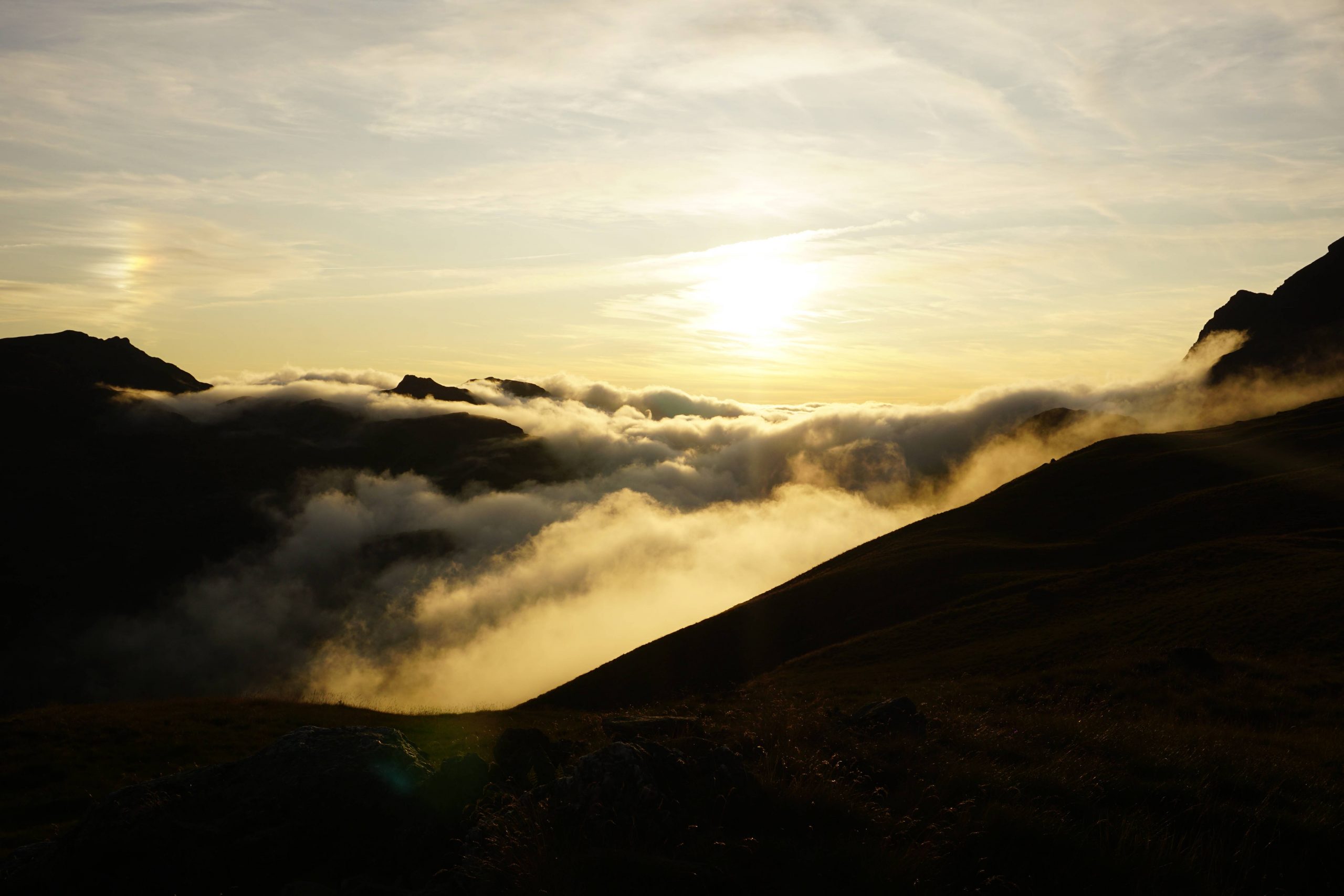The long climb up to Col de Tartereau took all day, we left Eylie around 10.30am and reached the top at 17.30. As we drew closer to the top, I could see glimpses of the sun behind the cloud around us. Throughout the walk I had maintained an optimistic view of ‘this cloud will clear any minute and there will be a beautiful vista before us’. It slowly came true as we made the final ascent to the col.